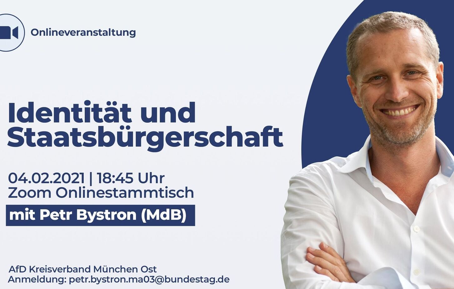 Von AfD Kreisverband München Ost|2026-03-12T07:30:35+01:0027. Januar 2021|Aktuelles, M-Ost Aktuell, Pressemeldungen, Veranstaltungen|Kommentare deaktiviert für Zoom-Veranstaltung mit MdB Petr Bystron am 4. Februar 2021 – Moderation: Rene Dierkes