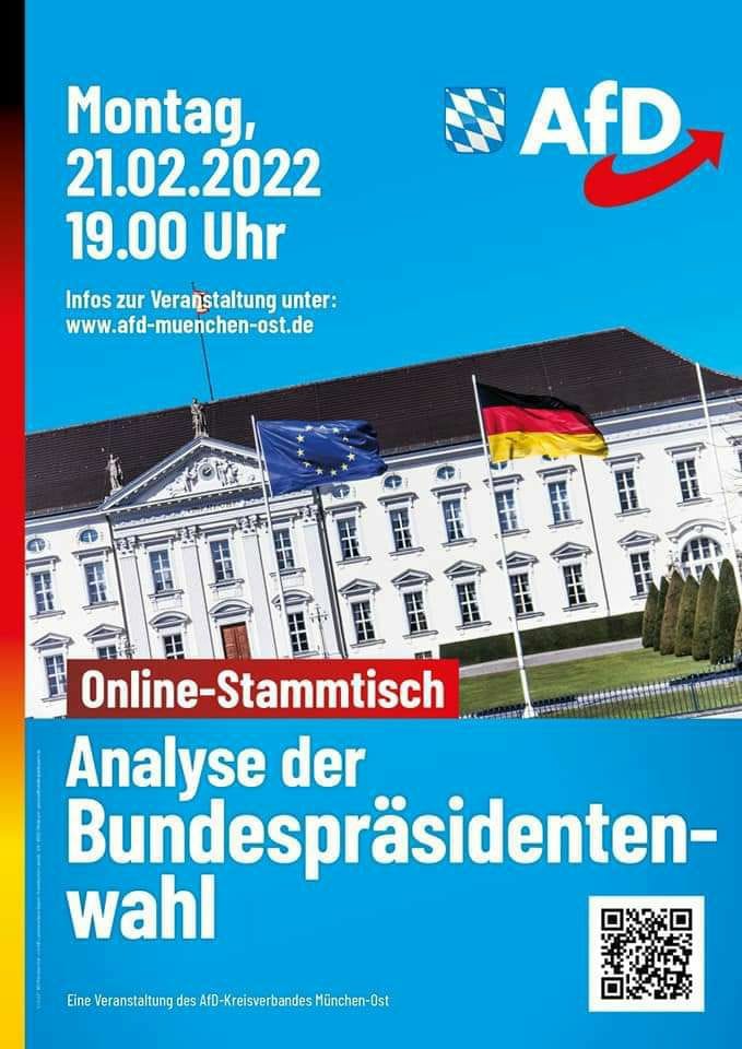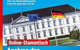 Der AfD Kreisverband München Ost lädt Sie zum kommenden Zoom-Stammtisch ein. Thema: Analyse der Wahl des Bundespräsidenten Redner: Petr Bystron, MdB Moderation: Rene Dierkes Zeit: 21. Februar 2022 um 19 Uhr (Einlass: 18.45 Uhr) Bei Interesse melden Sie sich bitte über kontakt@wordpress.tdmthemes.com an. Falls Sie das Programm Zoom noch nicht installiert haben, können Sie es [...]