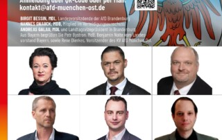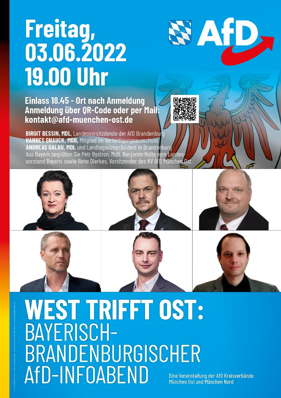 Werte Mitglieder und Interessenten der AfD, die AfD Kreisverbände München Ost und München Nord laden zum bayerisch-brandenburgischen Info-Abend ein. Seien Sie dabei, wenn Abgeordnete und Landesvorstände aus West und Ost zusammentreffen und über ihren politischen Alltag referieren. Es werden referieren: Birgit Bessin, Mdl, Landesvorsitzende der AfD Brandenburg Hannes Gnauck, MdB, Mitglied im Verteidigungsausschuss Andreas Galau, [...]