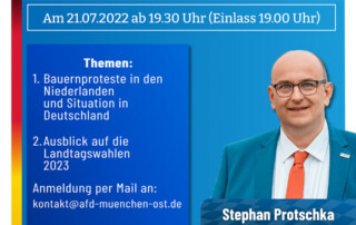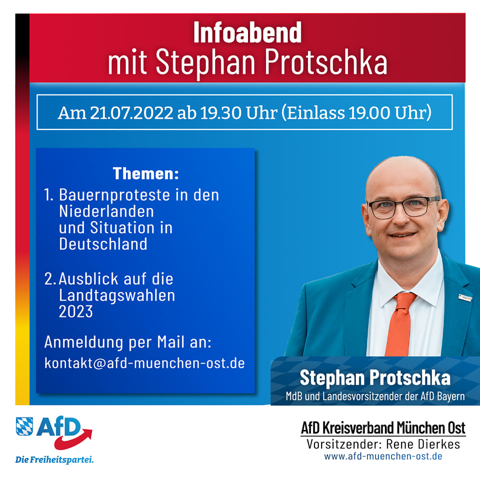 Werte Mitglieder und Interessenten der AfD, hiermit lade ich Sie herzlichst zum nächsten Infoabend des Kreisverbandes AfD München Ost ein. Dieser findet am kommenden Donnerstag, den 21. Juli 2022 ab 19.30 Uhr statt (Einlass ab 19.00 Uhr). Als Gastredner referieren wird Stephan Protschka, Landesvorsitzender der AfD Bayern. Themen: Bauerproteste in den Niederlanden und Situation in [...]