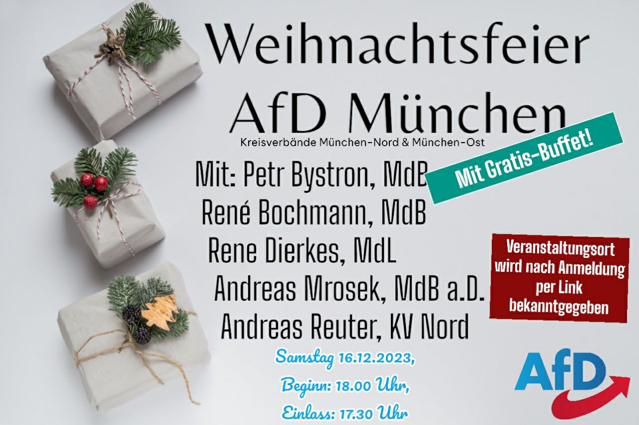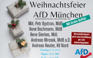 Impressionen von der Weihnachtsfeier der AfD-Kreisverbände München Ost & Nord: Das Lokal war voll, zahlreiche Gäste lauschten den Reden von Politikern aus Landtagen, kommunaler Ebene und auch Vertretern des politischen Vorfelds. Als Gastredner war u.a. Prof. Dr. Zerbin, AfD-MdL und OTL d.R. aus NRW mit an Bord. Wir konnten wieder neue Mitglieder gewinnen. Die guten [...]