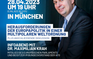 Impressionen von unserer Veranstaltung mit Dr. Maximilian Krah zum Thema "Herausforderungen der Europapolitik in einer multipolaren Weltordnung" am 28. April 2023 in München Alle Tische waren besetzt. Über 50 Teilnehmer lauschten der fulminanten Rede unseres Gastredners aus dem Europaparlament. Das komplexe Thema der Multipolarität und vor allem die Relevanz weltweiter Entwicklungen für den einzelnen [...]