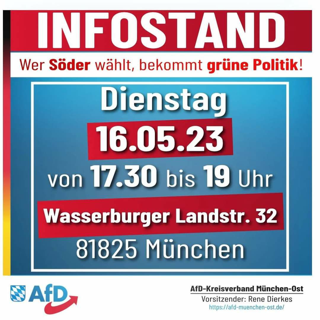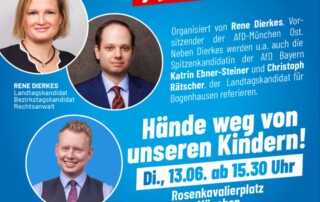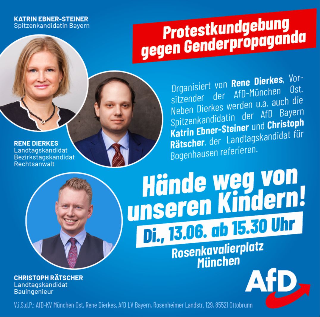 Am 13.06.2023 wollen wir uns ab 15:30 Uhr vor der Stadtbibliothek in Bogenhausen im größeren Rahmen versammeln, um unter dem Motto „Hände weg von unseren Kindern!“ für ein Verbot von Genderpropaganda und anderen Perversionen gegenüber Minderjährigen zu protestieren. Die Demo wurde von unserem Vorsitzenden und Münchener Landtagskandidaten, René Dierkes angemeldet und organisiert. Als Redner begrüßen [...]