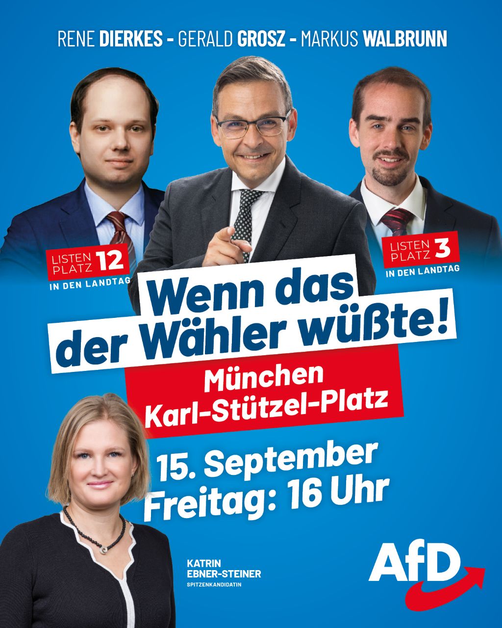 ☆ ☆Wahlkampfveranstaltung in München ☆☆ "Wenn das der Wähler wüßte!" mit dem österreichischen Kolumnisten und Publizisten Gerald Grosz und der bayerischen Spitzenkandidatin Katrin Ebner-Steiner u.a. Wir freuen uns auf Ihre Teilnahme! ------ Ihr Rene Dierkes Rechtsanwalt und Anwalt des Volkes Landtagskandidat in Oberbayern (Zweitstimme: AfD-Listenplatz 12) Am 8. Oktober AfD wählen und Bayern zurückholen!