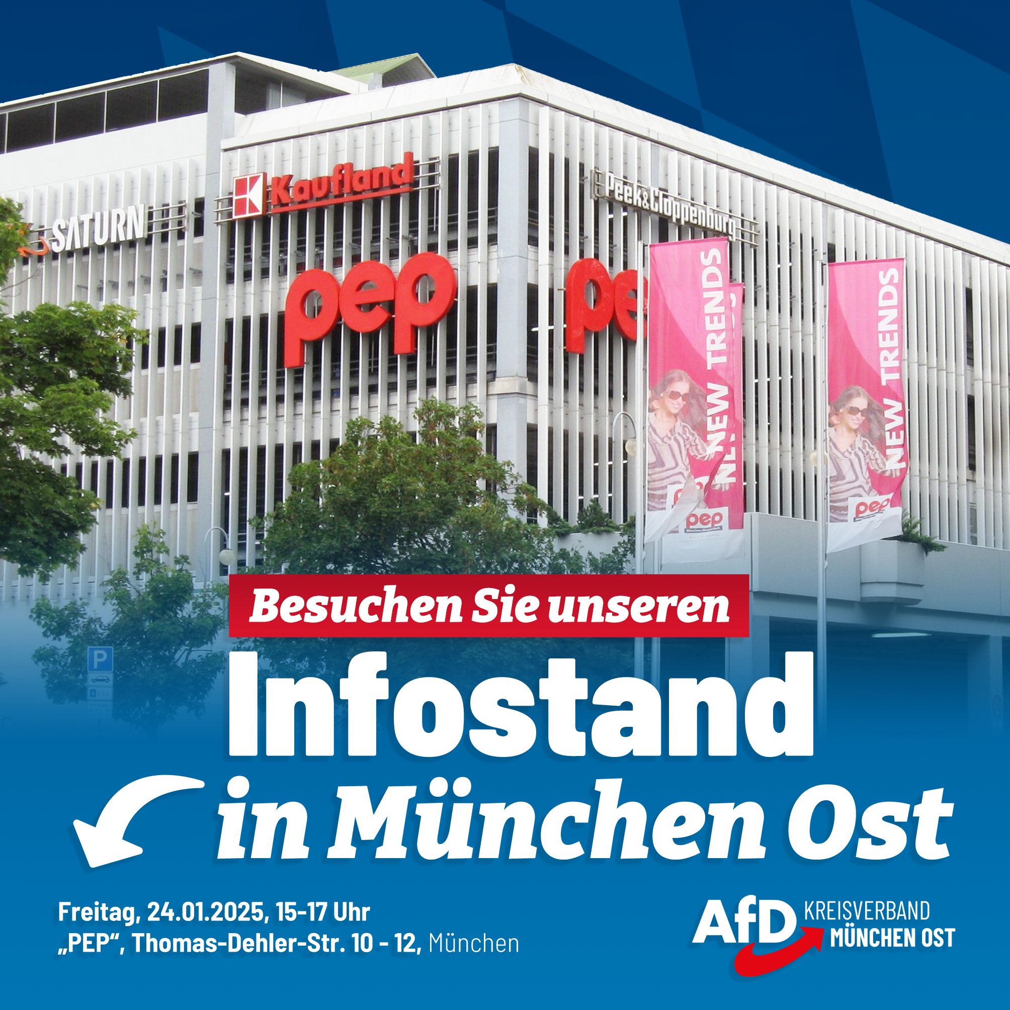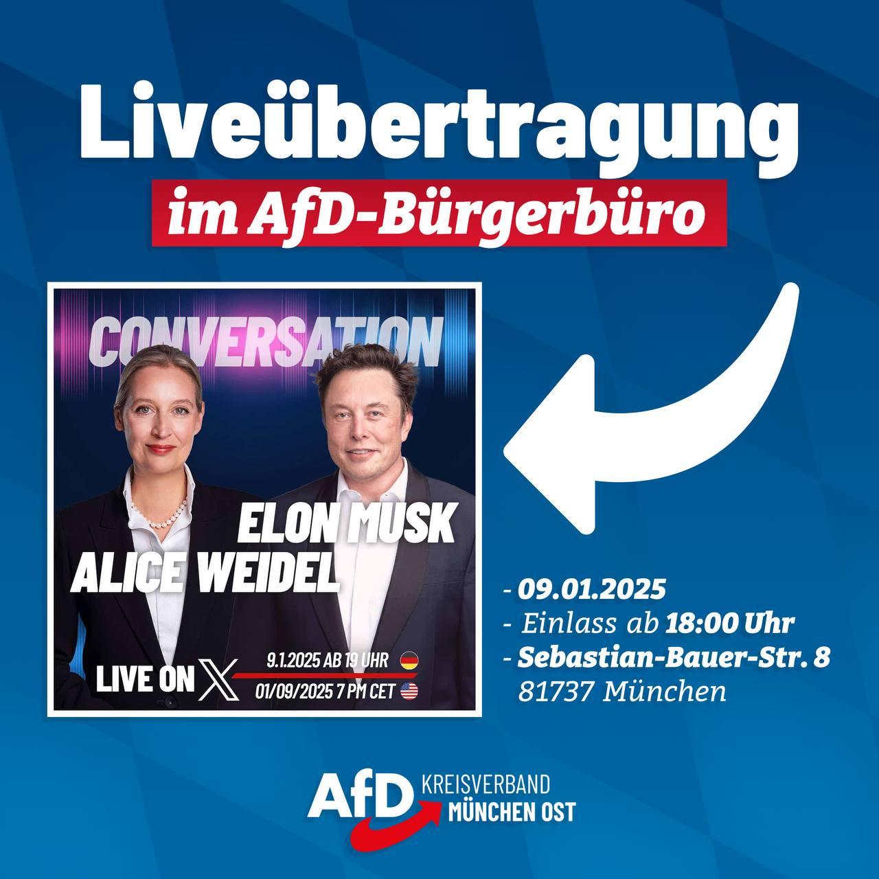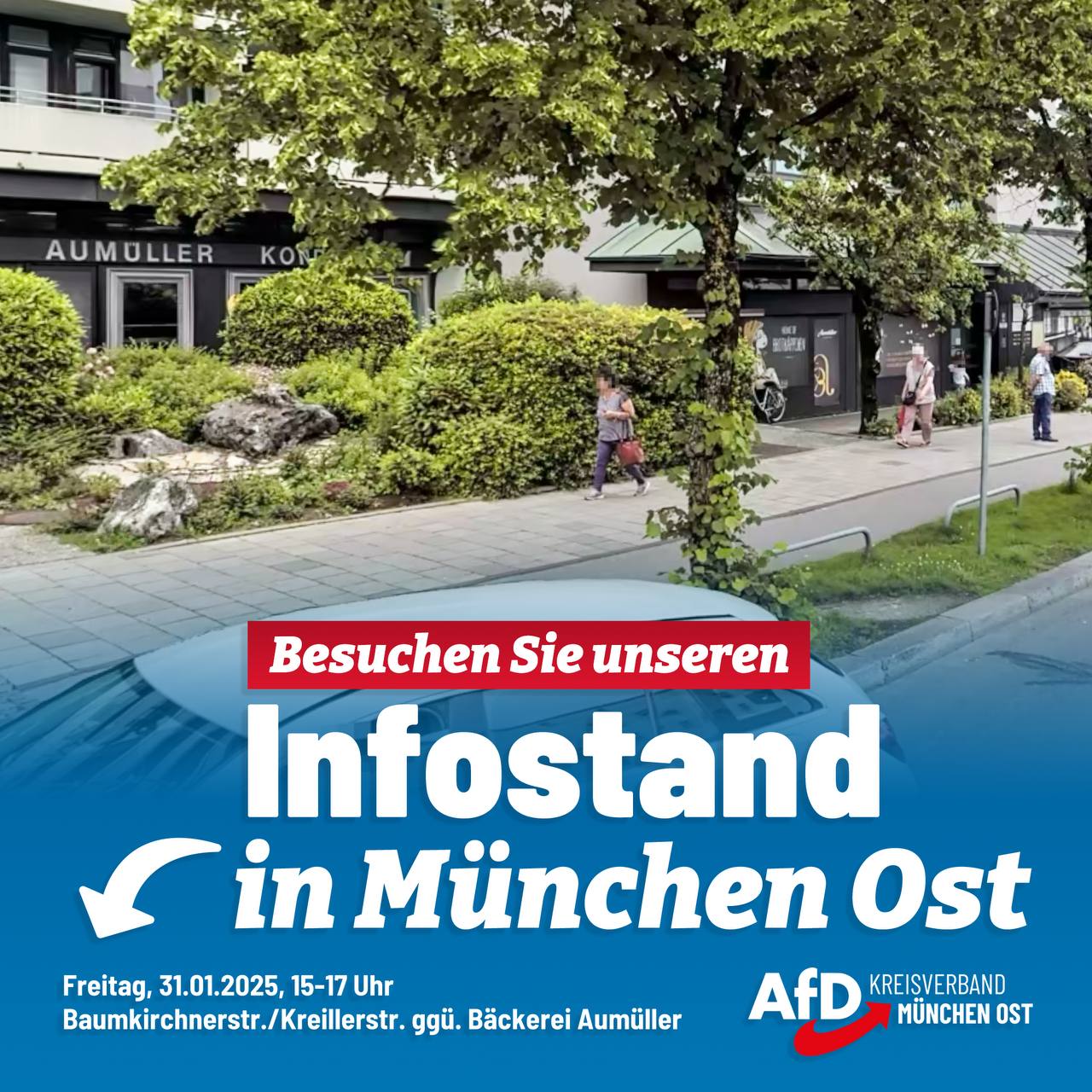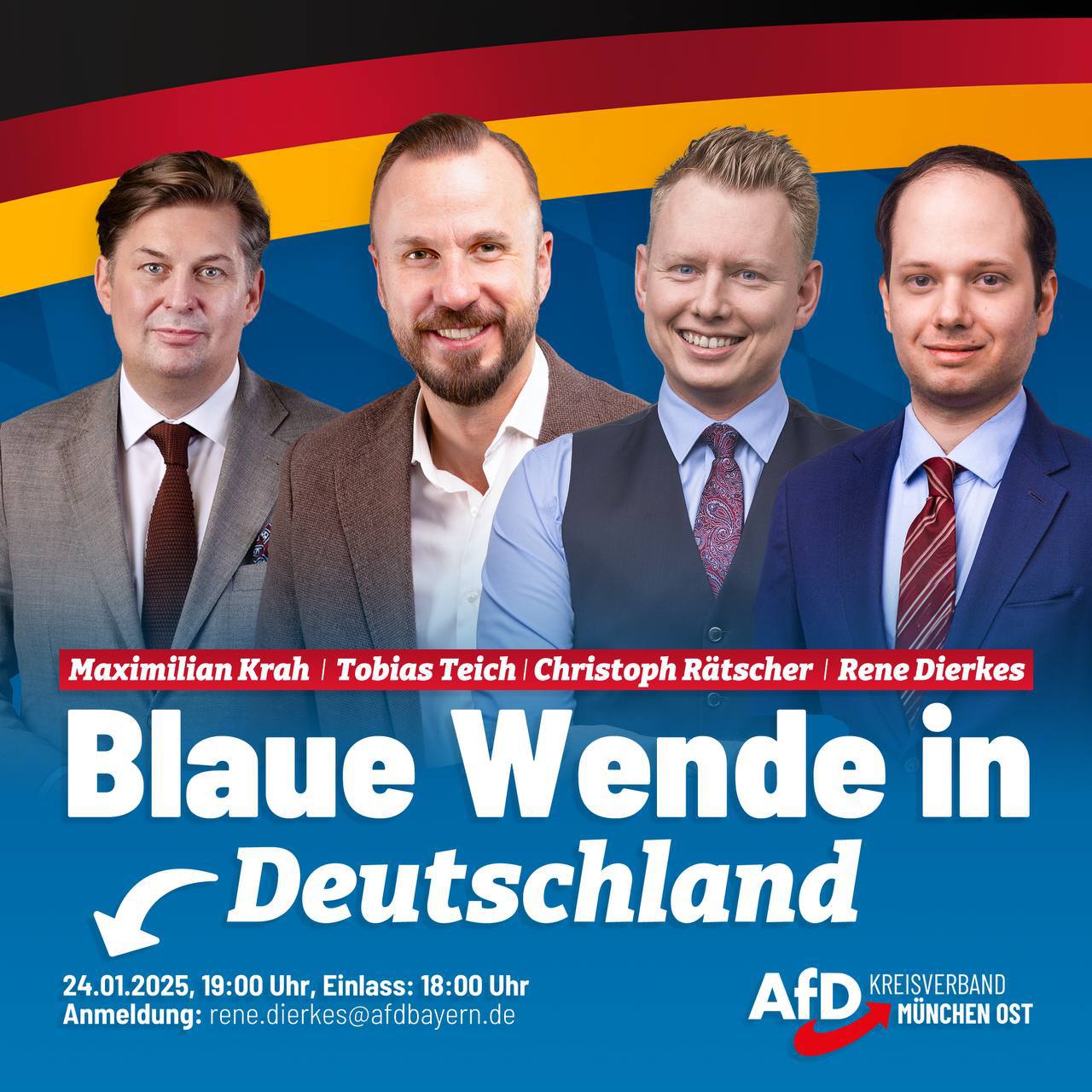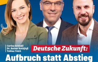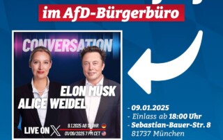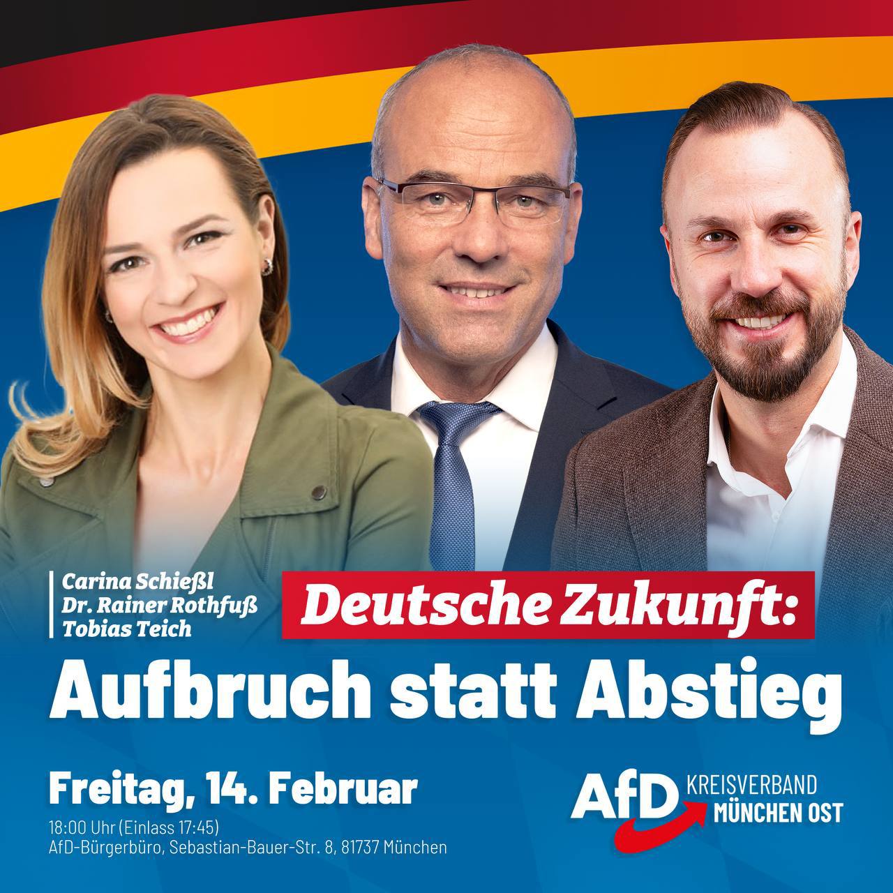 Wir laden Sie herzlichst ein zu unserer Wahlkampfveranstaltung „Aufbruch statt Abstieg“ am 14.02. (Beginn 18 Uhr/Einlass 17:45 Uhr) im AfD-Bürgerbüro München Ost in der Sebastian-Bauer-Str. 8, 81737 München. Mit dem Bundestagsabgeordneten Dr. Rainer Rothfuß sowie den Bundestagskandidaten Tobias Teich & Carina Schießl. Moderieren wird der Landtagsabgeordnete Rene Dierkes. Mitglieder des KV München Ost müssen sich [...]
