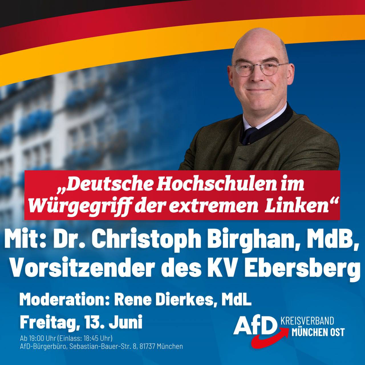 Wir laden Sie herzlichst ein zu unserem nächsten Infoabend am 13. Juni (Beginn 19 Uhr/Einlass 18:45 Uhr) im AfD-Bürgerbüro München Ost in der Sebastian-Bauer-Str. 8, 81737 München. 🏫 Der Bundestagsabgeordnete Dr. Christoph Birghan wird über linksextreme Strukturen in Hochschulen und seine Tätigkeit im Bundestag berichten. Im Anschluss können wieder Fragen gestellt werden. ℹ️ Nicht-Mitglieder des [...]