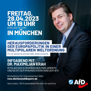 Impressionen von unserer Veranstaltung mit Dr. Maximilian Krah zum Thema „Herausforderungen der Europapolitik in einer multipolaren Weltordnung“ am 28. April 2023 in München