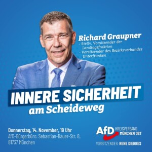 Richard Graupner, MdL, Bezirksvorsitzender der AfD-Unterfranken, wird zum Thema „Innere Sicherheit am Scheideweg“ referieren, Einblicke in die Landtagsarbeit des Innenausschusses geben und konkrete Lösungsansätze aufzeigen.
