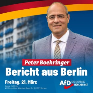 Wir laden Sie herzlichst ein zu unserem nächsten Infoabend am 21. März (Beginn 19 Uhr/Einlass 18:45 Uhr) im AfD-Bürgerbüro München Ost in der Sebastian-Bauer-Str. 8, 81737 München.